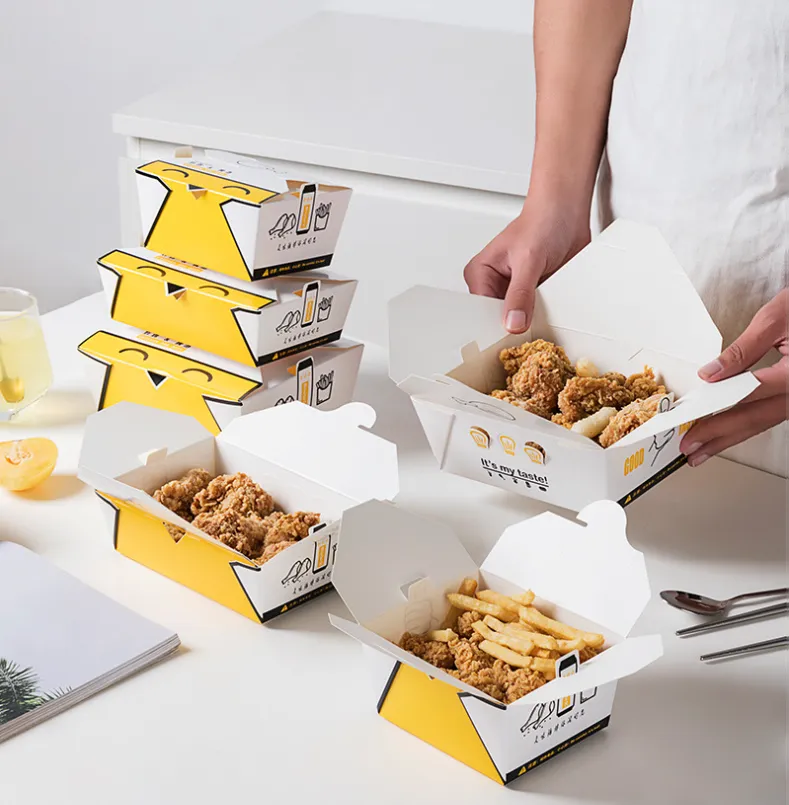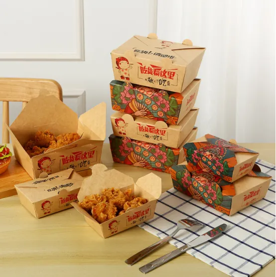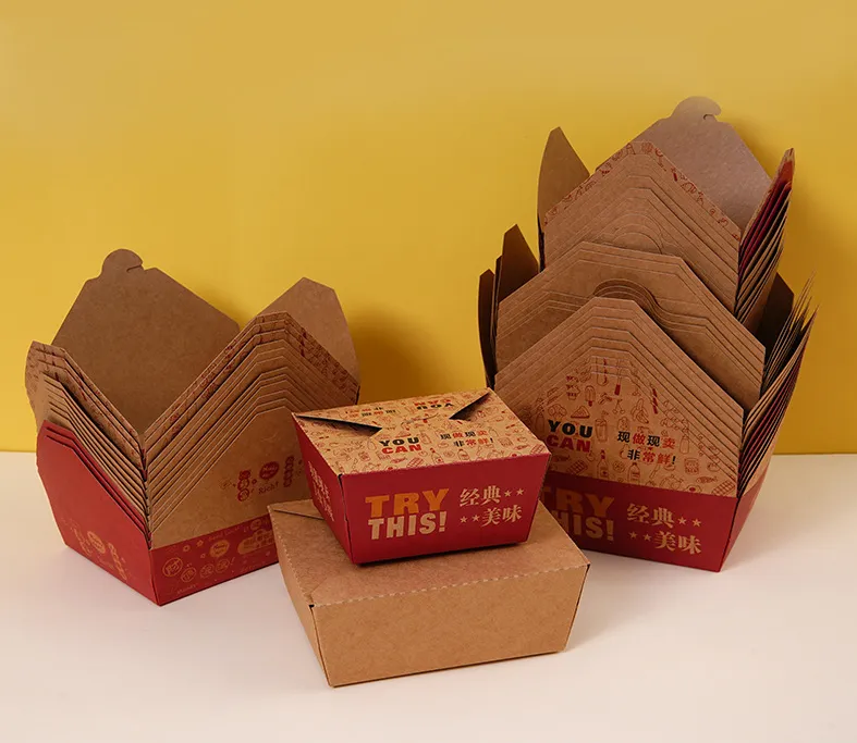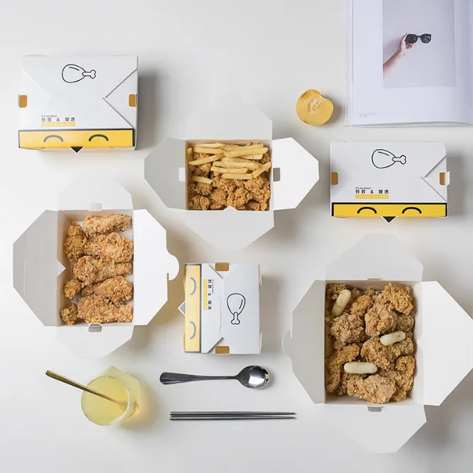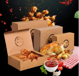 Fried chicken box är en typ av friterad kycklingpappersförpackningsbehållare speciellt designad för snabbmatsindustrin. Den stekta kycklinglådan är gjord av livsmedelsgodkänd kartong som är resistent mot höga temperaturer och oljor, vatten- och läcksäker, lämplig för varmt och kallt och lätt att förpacka. Det är en praktisk friedchicken box med bra tätning och isolering, som effektivt kan bibehålla fräschören och temperaturen hos stekt kyckling. Den stekta kycklinglådan som produceras av Zemeijia-fabriken stöder skräddarsydd utskrift och är lämplig för hämtmat, catering och festscener.